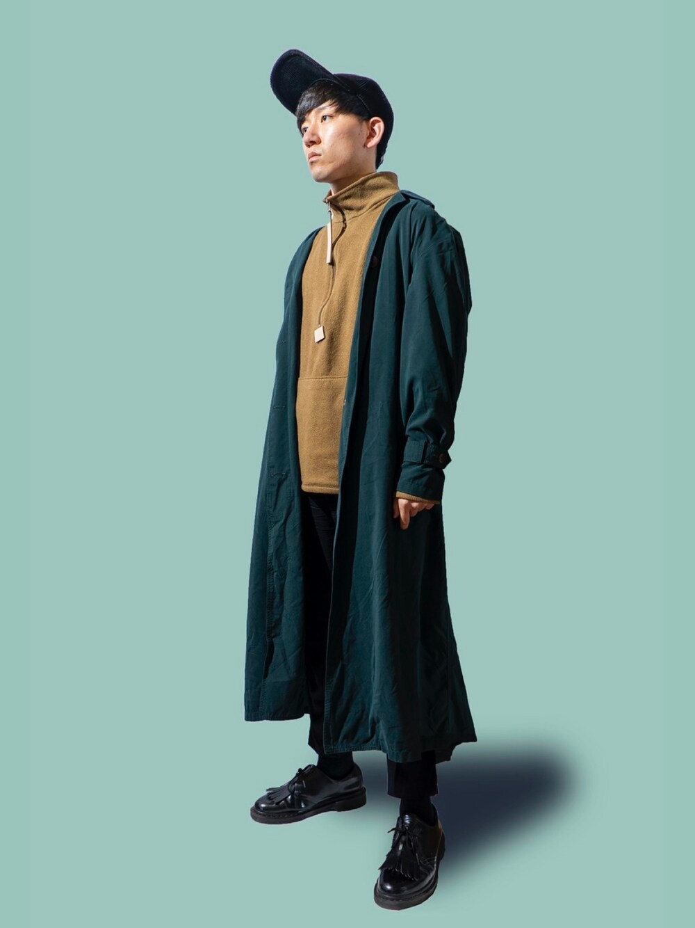 キャップ:MYNE コート:vintage:高円寺の古着屋:5000円 トップス:vintage:2ndstreet:1300円 パンツ:Helmut Lang:2ndstreet:3500円 ソックス : UNIQLO シューズ:Dr.martens