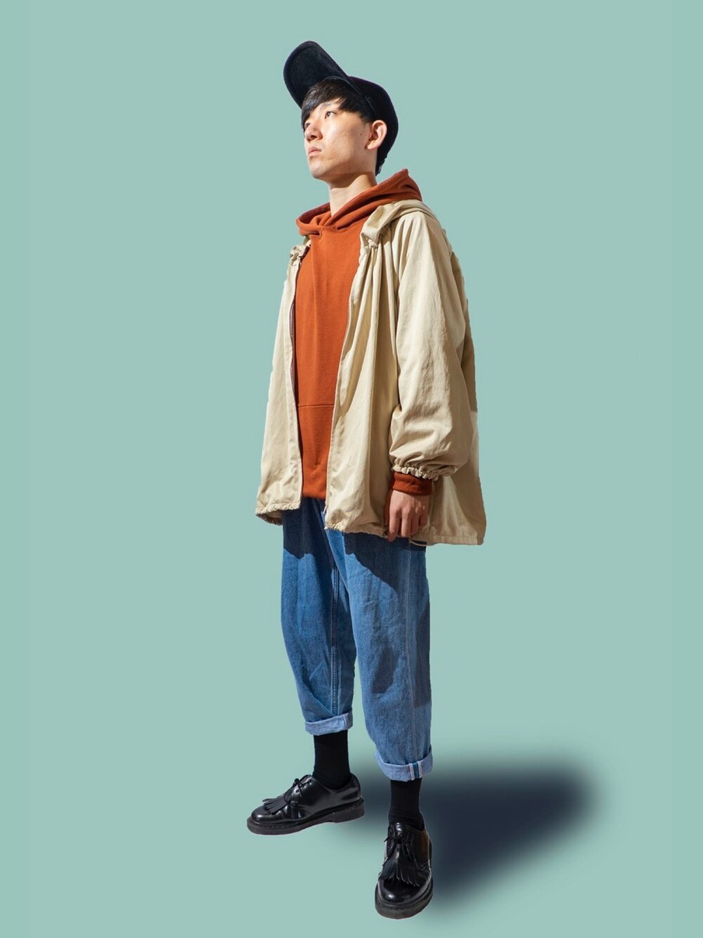 キャップ:MYNE ジャケット:Whim Gazette:2ndstreet:6000円 パーカー:vintage:2ndstreet:3500円 パンツ:Freaks store:2ndstreet:1300円 シューズ:Dr.martine