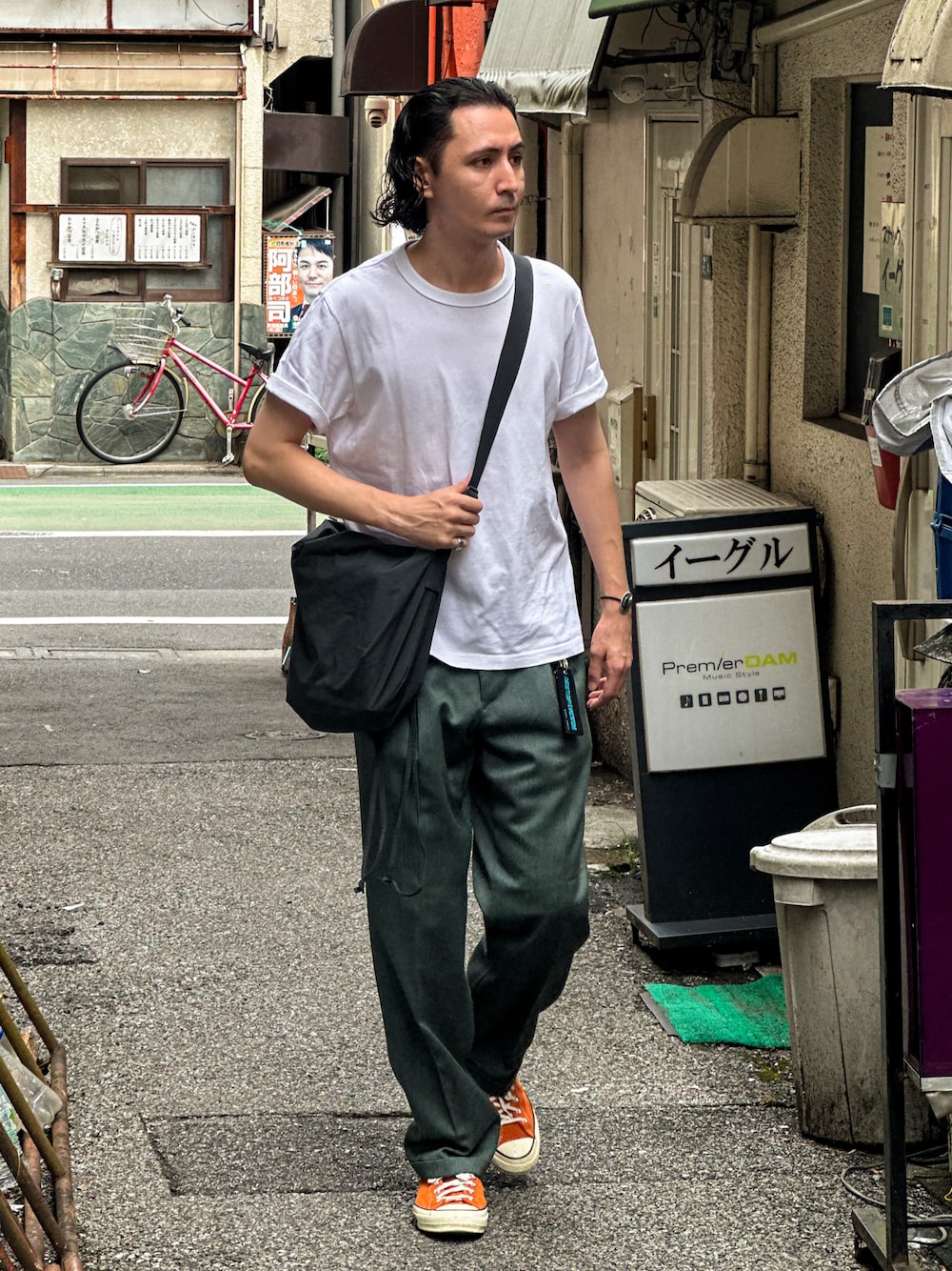 ワイドスラックスに白の無地T というシンプルな合わせ 袖をまくってシルエットに強弱をつけたり、 アクセやキーホルダーの小物でアクセント、 仕上げにはオレンジのチャックテイラーで差し色を入れてみました🙃 大人で爽やかな雰囲気もあるし、 力を入れすぎてない感じもあって 個人的に好きな合わせです🙌