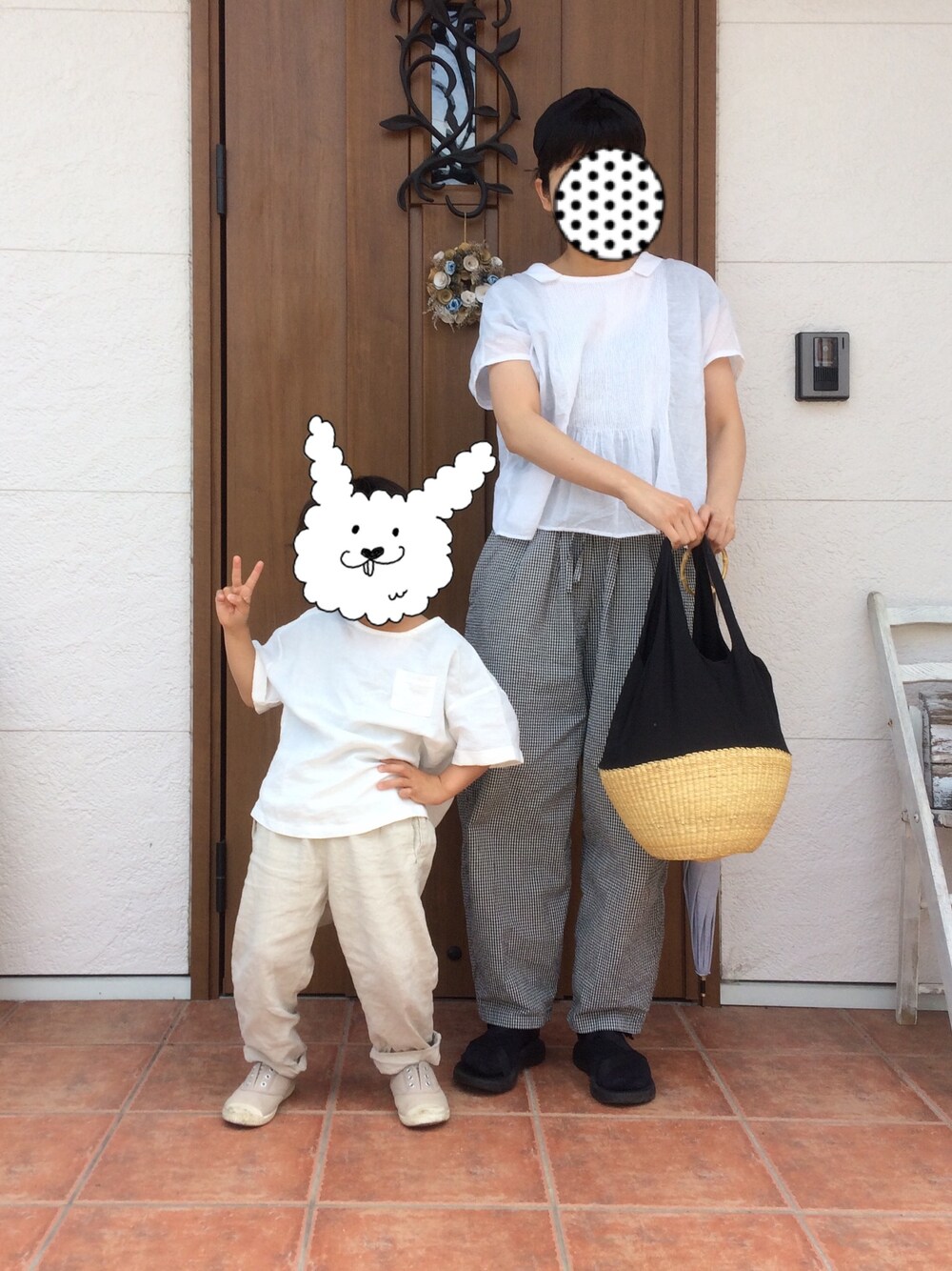 前回のコーデの時のブラウスもそうですが、カディコットンのブラウスは本当に軽くて涼しいのでオススメです✨ 息子は、あまりにも変顔してたので今日はスタンプ💦