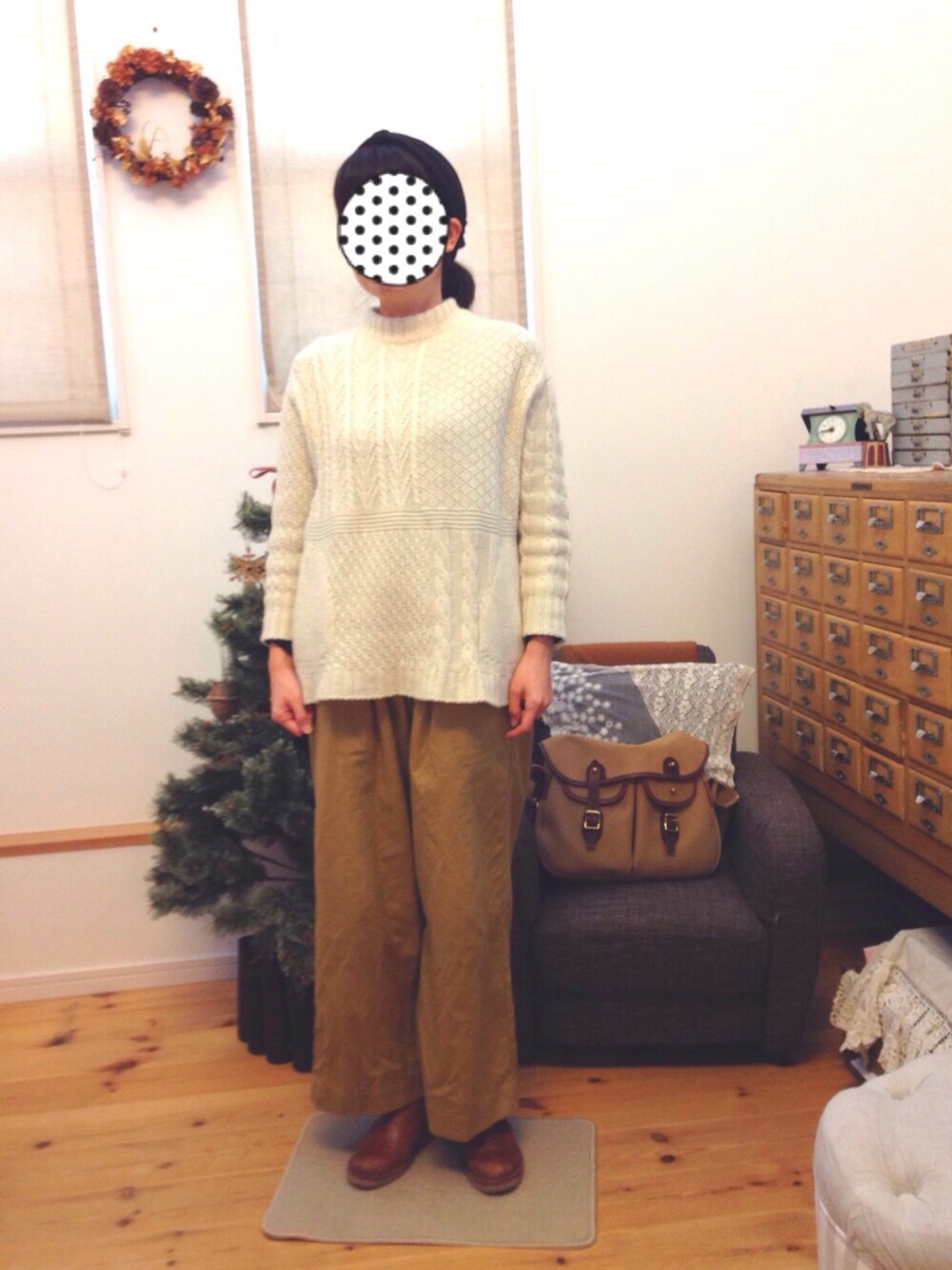 クリスマスなのでツリーがあるリビングで撮ってみました◎ ツリーは何度も猫に倒され、オーナメントも何個も壊されてしまい…寂しい感じになっています💦 去年買ったコンジェのニットは、とっても柔らかくて着心地良し✨です。