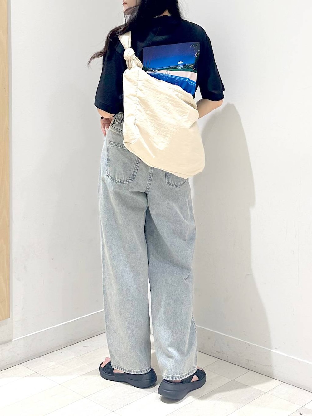 ご覧いただきありがとうございます👣⸒⸒ 海辺を切り取ったようなバックプリント🌊 Tシャツ主役で楽しむ夏のゆるカジコーデ! ラフだけど手抜きに見えない1枚です🎐 ------------------ ▷◁ ぜひいいねとフォローお願い致します📓🔎