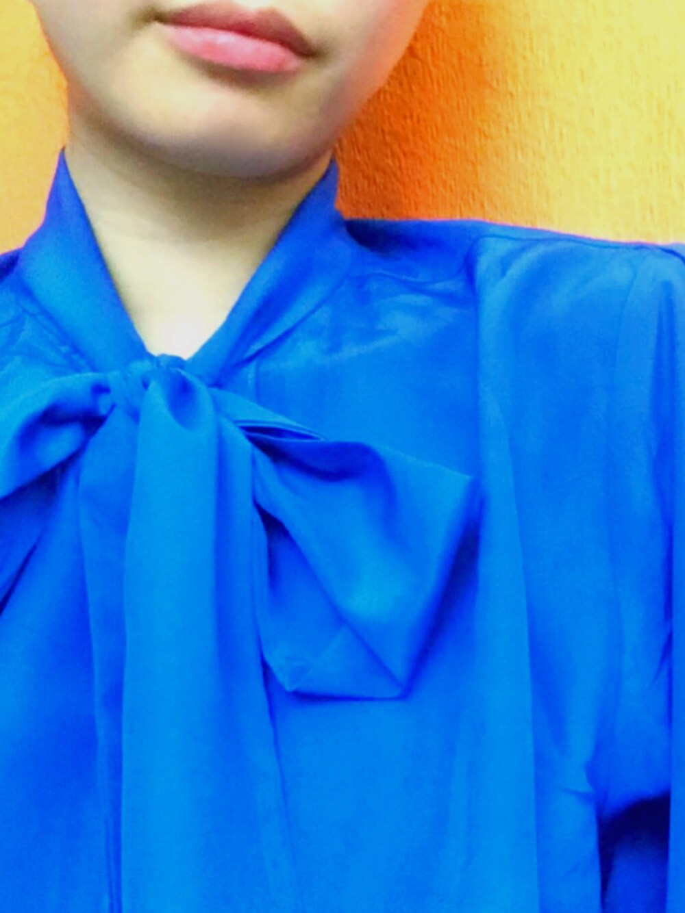真っ青なリボンタイのブラウスを着たよ! 農家の台所っていうお店に行ったら店員さんがすごいブラウスを褒めてくれて嬉しかった〜😭