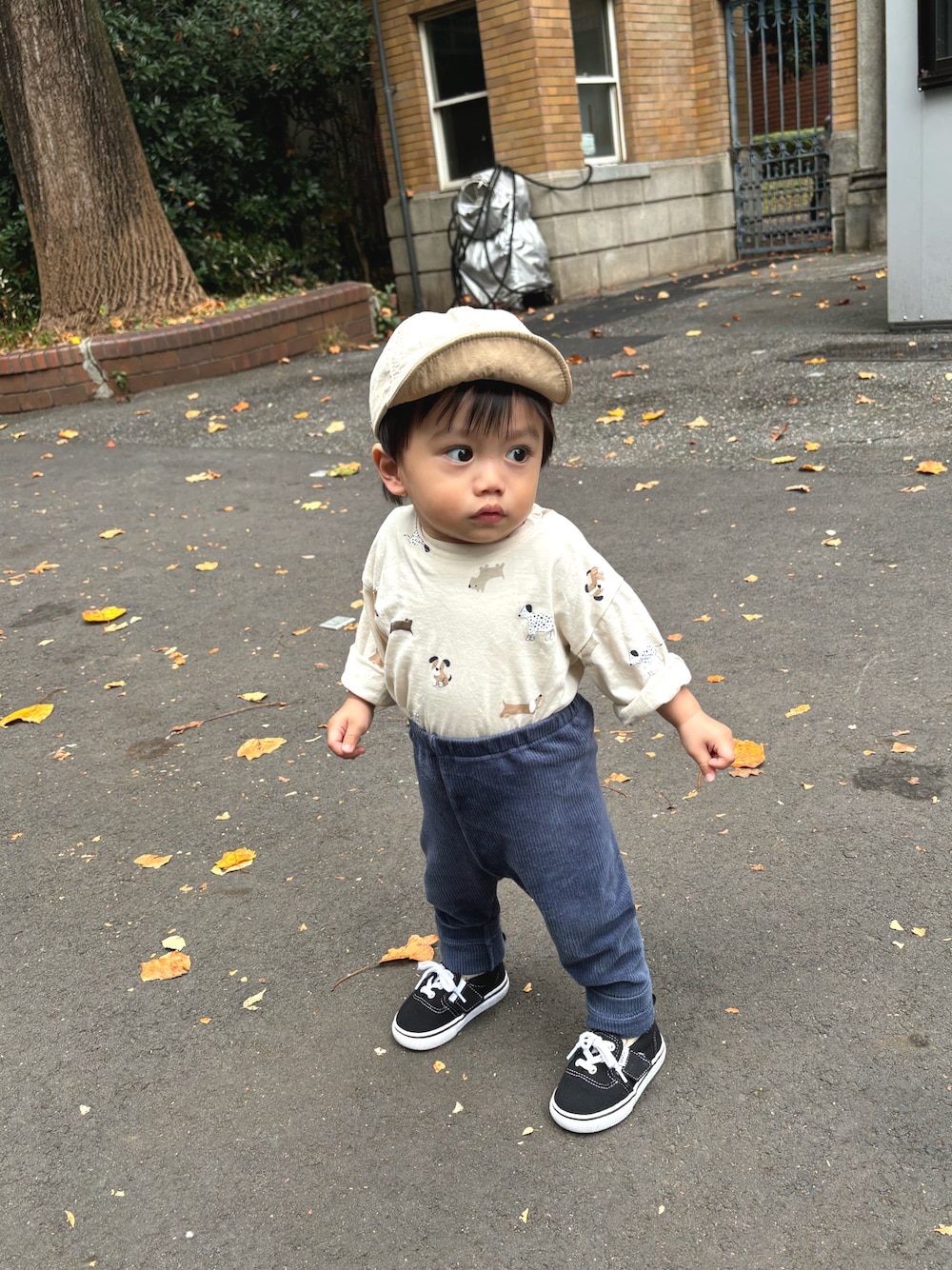 H&Mの犬柄Tシャツ。薄い分重ね着しやすくてお気に入りです。