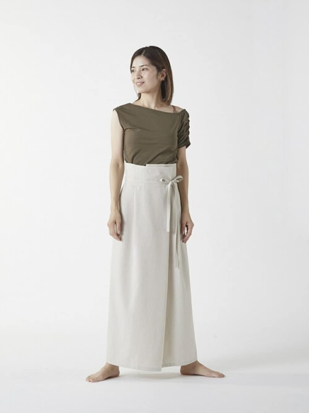 トップス:0(S~M)サイズ スカート:F(フリー)サイズ カーキのトップスとベージュのラップスカートで、ナチュラルな大人カジュアルコーデにしました。 トップスはそのままワークアウトOK、スカートはレギンスを仕込めば脱ぐだけで即ヨガモードに。動きやすさと手軽さを両立した、忙しい日にも頼れるスタイルです。