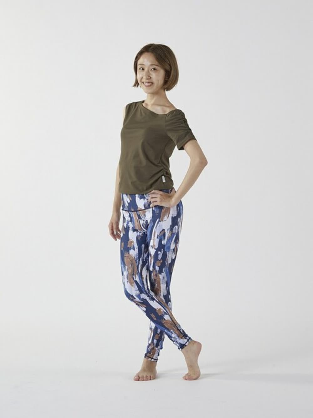 トップス:0(S~M)サイズ レギンス:0(S~M)サイズ 最初はどうかな?と思ったけど、着てみたら驚くほど快適! 伸縮性抜群のアシンメトリートップスは、腕を上げる動作もスムーズです。 パキッと映えるブルーのレギンスも、カーキのトップスが大人っぽく落ち着かせてくれます。