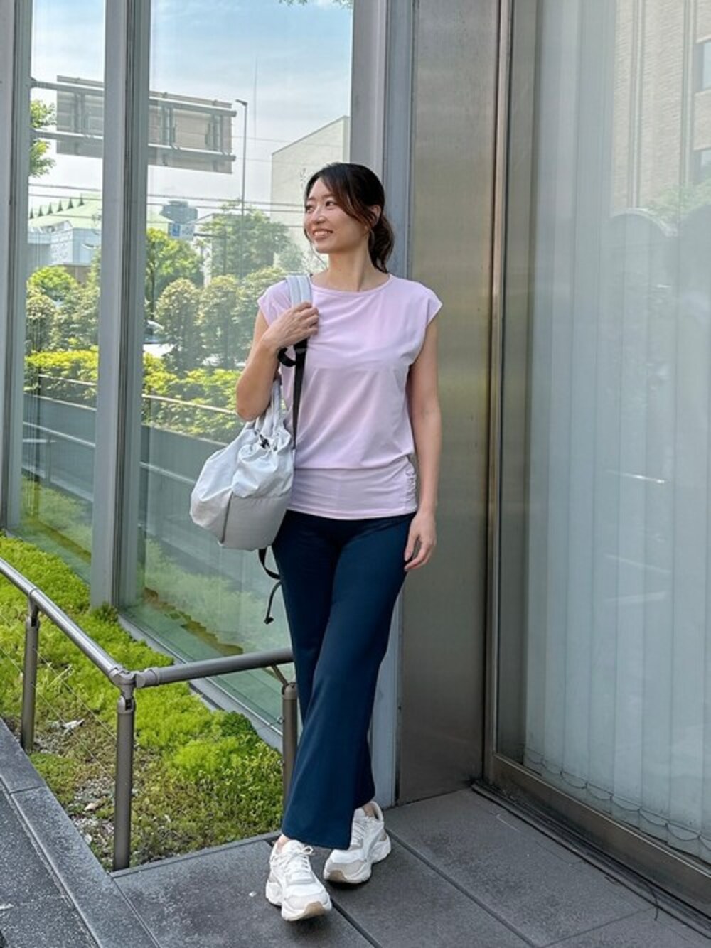 トップス:0(S~M)サイズ パンツ:0(S~M)サイズ バッグ:F(フリー)サイズ 腰回りがフィットするトップスは、ヨガのレッスン中もめくれず快適で、これまでに何枚も購入しています。 新色のピンクは大人も着やすい色味で、顔まわりを明るく見せてくれます。 半袖でもノースリーブでもない、少し肩にかかる絶妙な長さで、腕も細見えします。