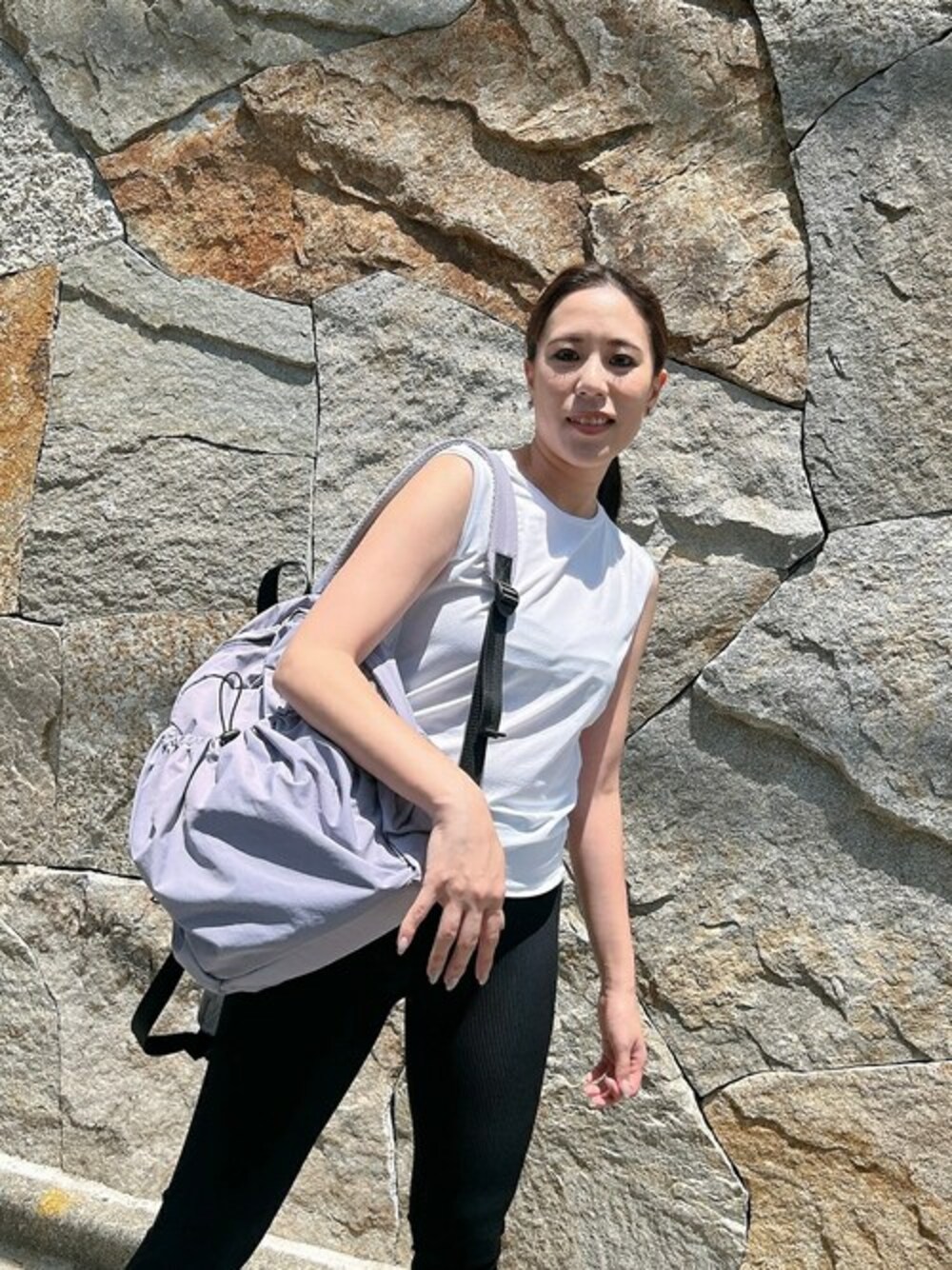 トップス:F(フリー)サイズ レギンス:0(S~M)サイズ バッグ:F(フリー)サイズ ※8月発売(PR0_B1953EBG012_i) 白のノースリーブトップスに、リブ素材の黒レギンスを合わせた、シンプルアクティブコーデです。 伸縮性抜群なので、このままランニングやジムにも◎。 パープルの大きめリュックをプラスすれば、こなれ感も出て、お出かけにもぴったりなスタイルになります。