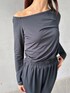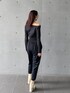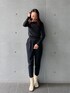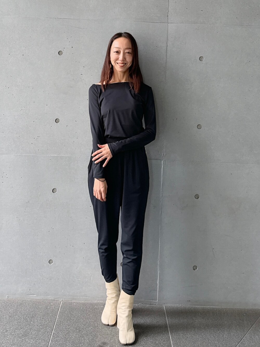 トップス:F(フリー)サイズ パンツ:0(S~M)サイズ Ecocoシリーズのセットアップにブーツを合わせ、大人っぽく仕上げたコーデです。 ギャザーパンツはスニーカーだけでなく、ブーツにも好相性です。 トップスは片方の肩が覗くアシンメトリーデザインで、オールブラックでも抜け感をつくれるのが魅力です。