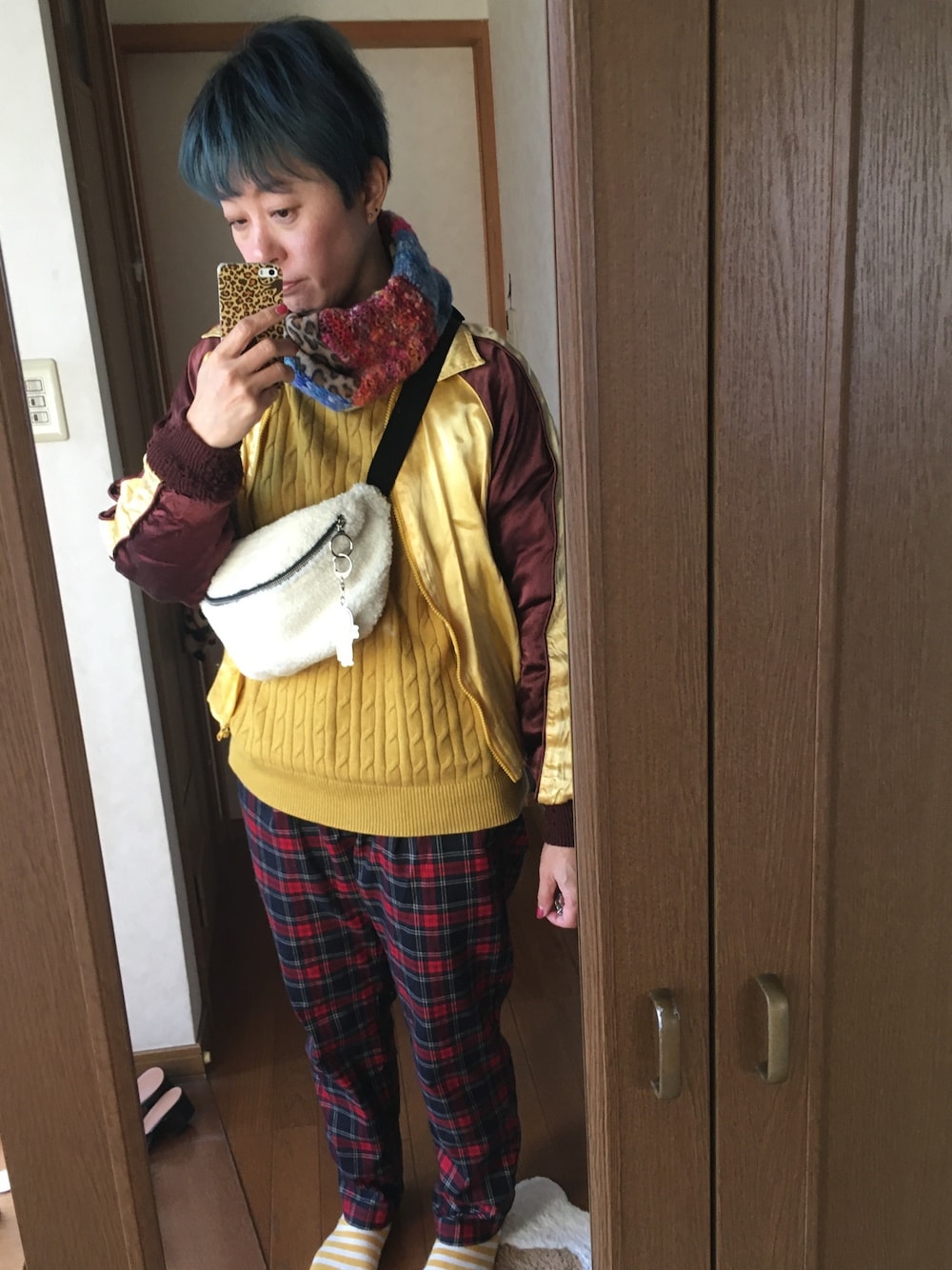 似たようなコーデ続きですが。 スカジャンホントお気に入り。 赤と黄色大好きな原色❤️