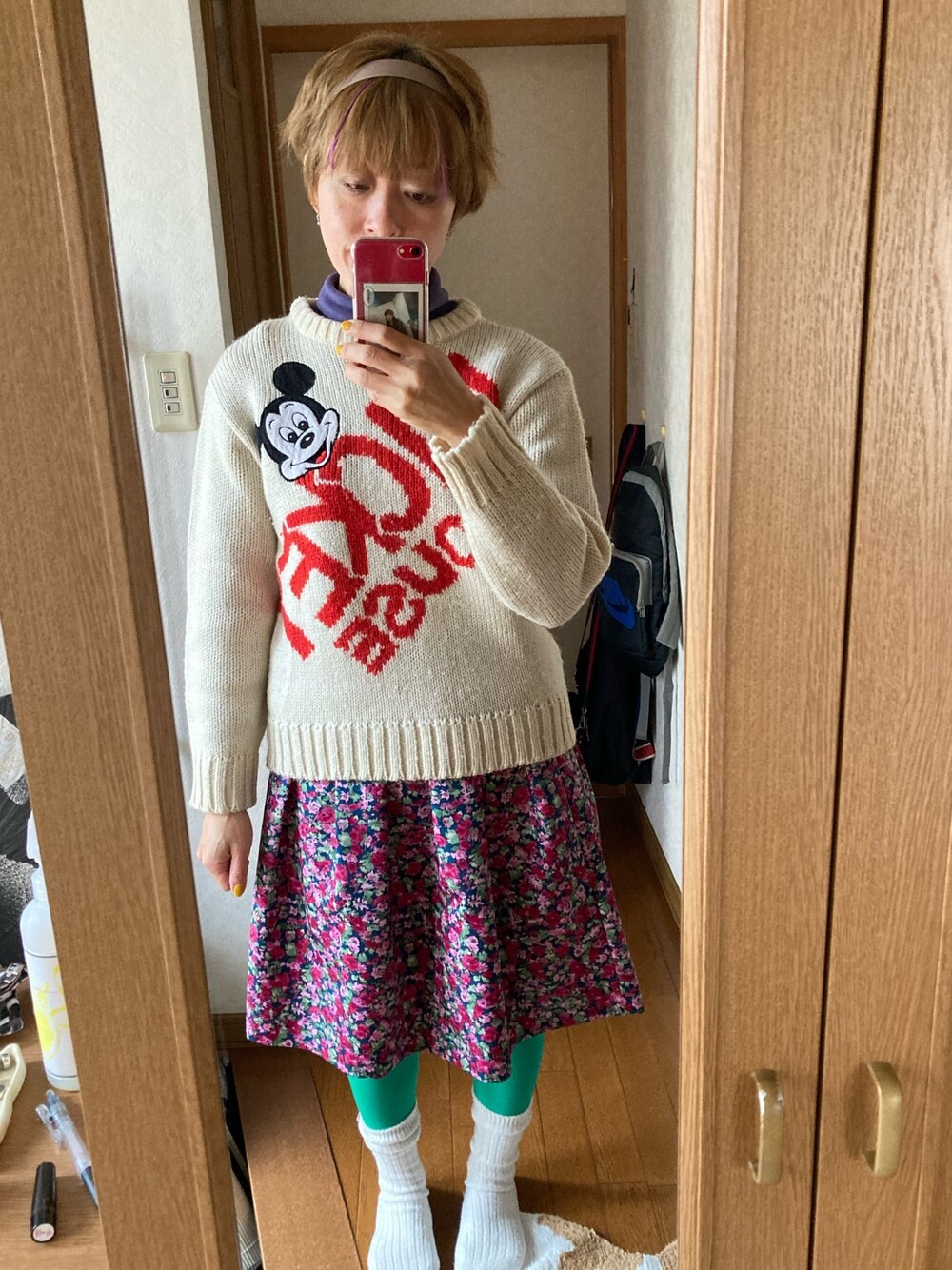 カチューシャブーム到来。 古着のニットはネットで見て一目惚れ。 スカートはいつも行く古着屋さんの店頭で相変わらず500円のラックから見つけ出したもの。 カラータイツ、なぜか去年派手な色をめちゃくちゃ買ったから脈略なく履いていきたいです。