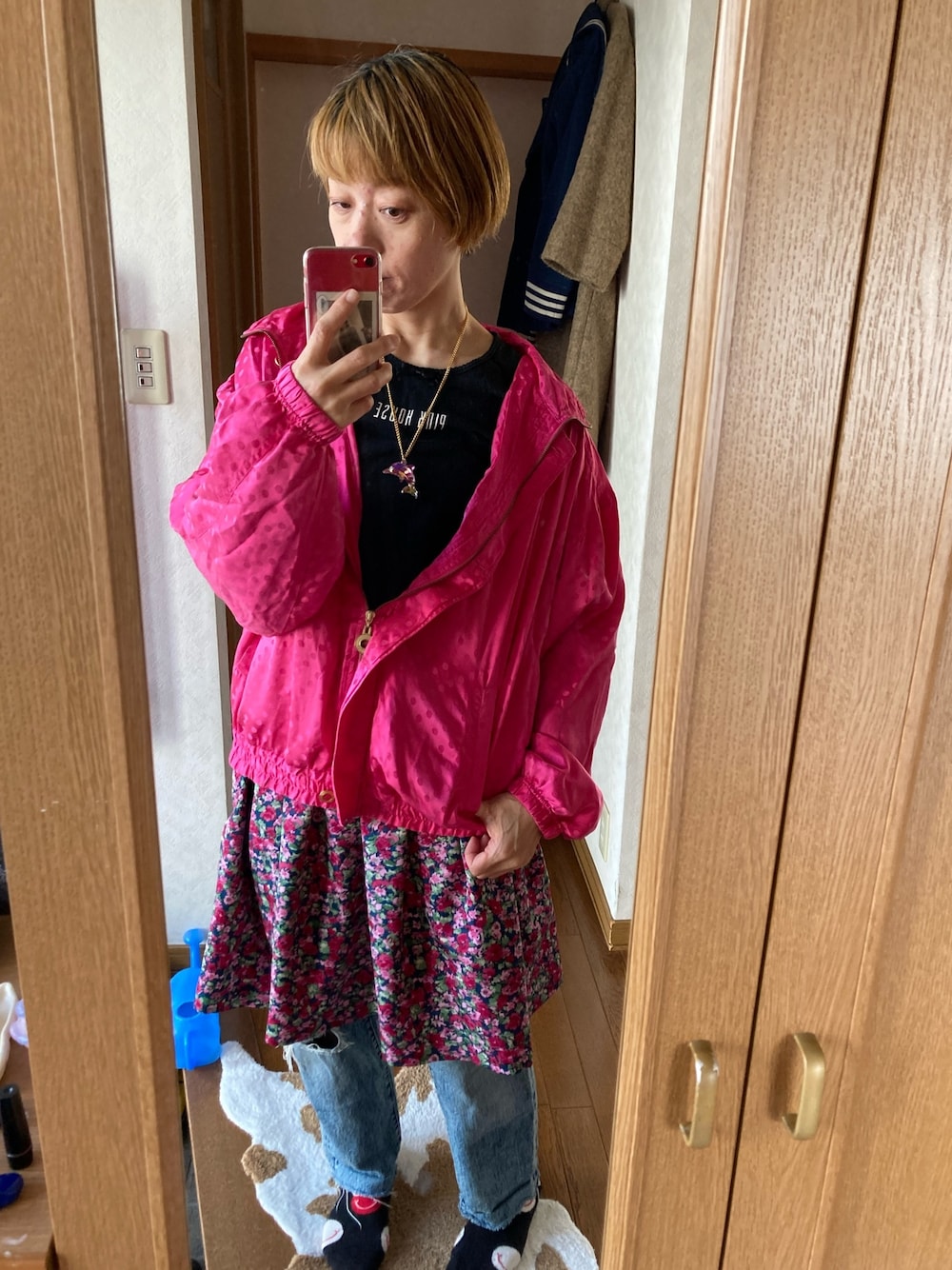 レッド祭りちょっと逸れました。 これからお出かけで、古着で買ったシルクのピンクに水玉ブルゾンがどうしても着たかった春。 最近気に入って付けてるイルカのネックレス、昭和な雑貨屋さんの通販で350円くらい。キッチュでキラキラこういうのほんと好き