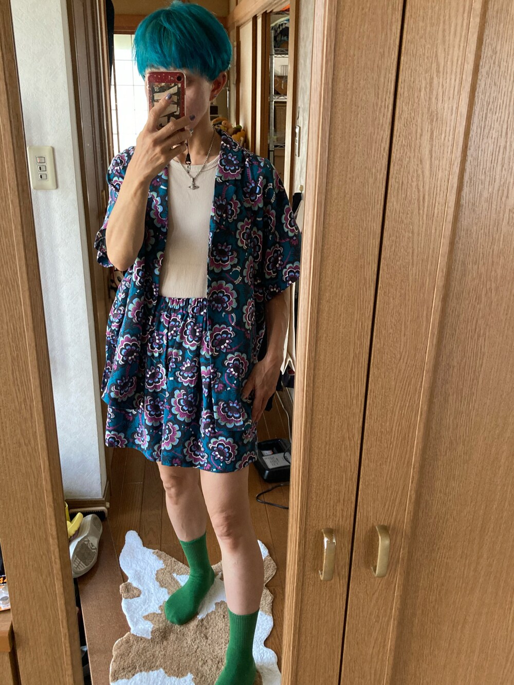 むしゃくしゃしてたから 昨日帰ってからマニパニで 髪の毛染めた。 ターコイズブルーみたいな 色になった、満足。 アロハセットアップ セールになってたタイミングで ゲットしちゃった。 気分が沈むと派手になるから 沈んでるってわかりにくいw