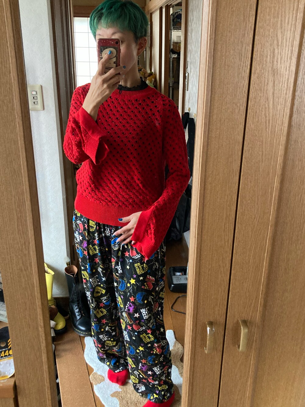 昨日と今日 家で作業日だからゆるゆる。 赤ニットは袖のスリットが 可愛いしキラキラしてるから スカート合わせて綺麗めに 着たらいいかな。 とりあえずイージーパンツ