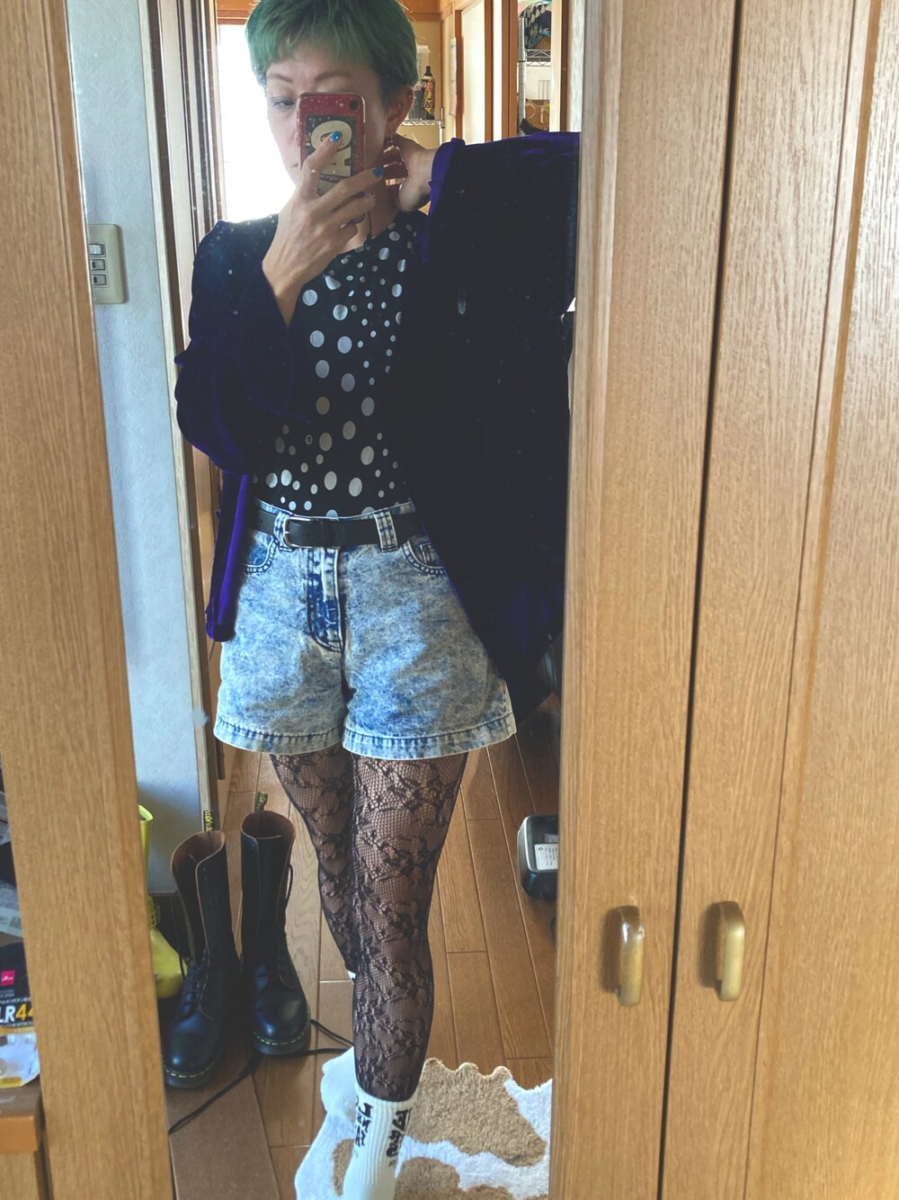 これにエンジニアブーツ ライブコーデ 羽織はベロアで 写真より鮮やかな紫 寒くなるとショートパンツor ミニスカートに120デニール くらいのタイツはいて脚出すのが 好きかも。 今日は柄の編みタイツ