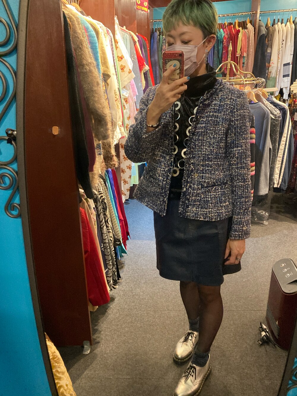 今日の仕事着 ツイードジャケットは 去年買ったやつ 羊革のミニスカートに シルバーのマーチン アクセもシルバーで