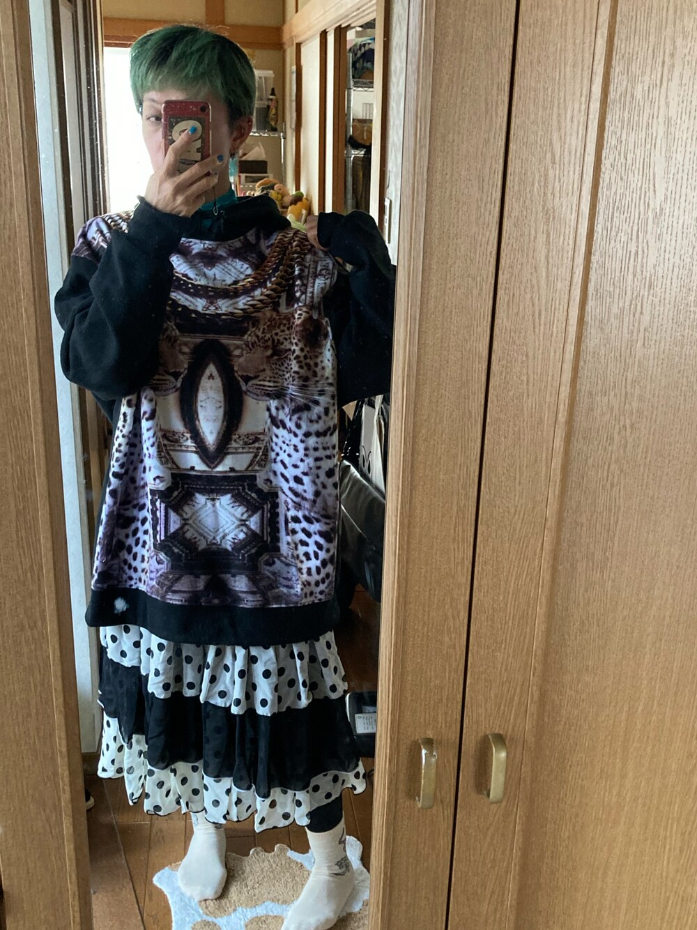 わかりにくいけど ヒョウ二匹、チェーン柄 強めパーカーに ボリュームスカートで たっぷり目に