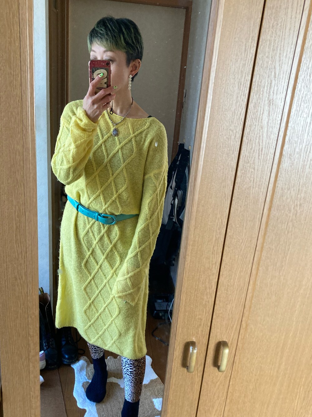 1/3ライブコーデ 年末にフラッと入った 古着屋さんで見つけた 黄色いふわふわニットワンピース 水色のベルトも同じお店で 見えにくいけどタイツもレオパ 今年も推しを推します💛