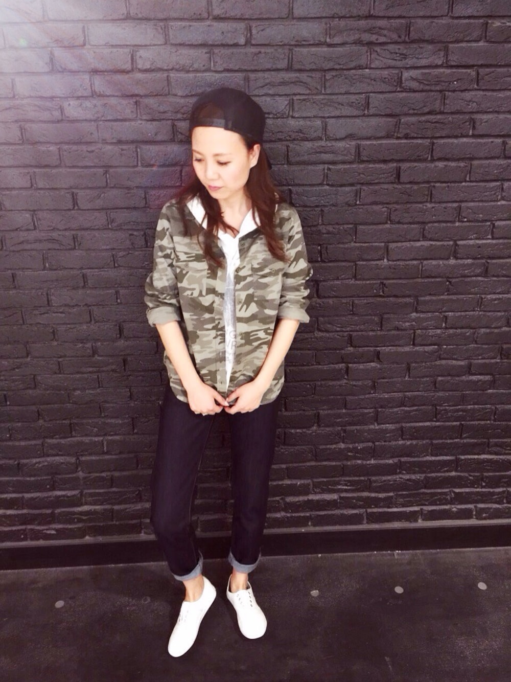 メンズライクなカモフラ柄シャツで、 アウトドアスタイルにお勧めのコーデ✧*。 スリッポンとキャップ後ろかぶりでとことんカジュアルに(`・ω・´)b フード付きのトップスはやわらかい素材で肌触りが良く、これからの季節におすすめですよ♡