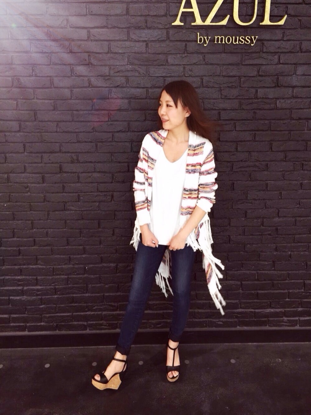 フリンジのデザインがポイントのニットカーデ♡ 春カラーのボーダーの色合いがかわいいですよね(*Ü*) インナーはシンプルなVネックTでスッキリと合わせました!!