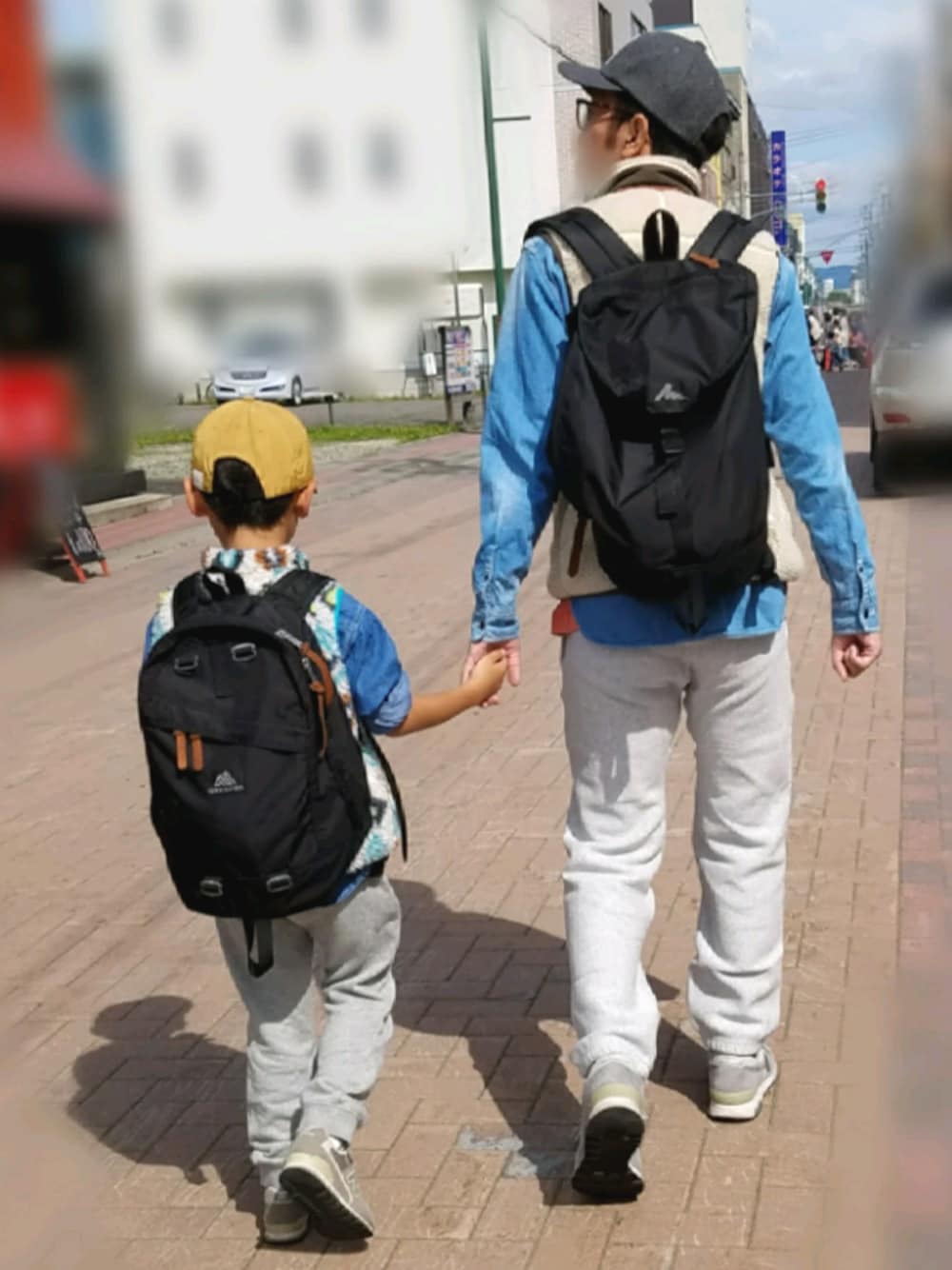 パパと息子のリンクコーデ! 寒くなってきたからパタゴニアのフリースベストを着ました。シャンブレーシャツ、ベスト、グレゴリー、チャンピオンスウェット、ニューバランスでリンク