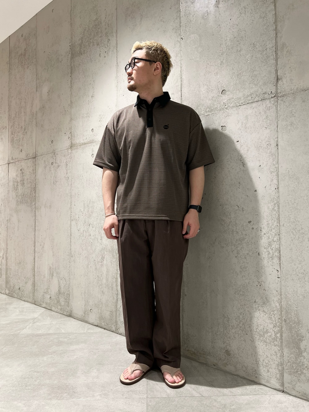 Sonny LabelからOOPSカットジャガード半袖ポロシャツを中心としたカジュアルコーデ! ゆったりとしたサイズ感なので幅広い方に着用していただけます! ゴルフウェアとしてはもちろん、普段着としても様になる一着です!! 全身をブラウントーンでまとめて大人カジュアルな印象に👍 おすすめスタイルです!
