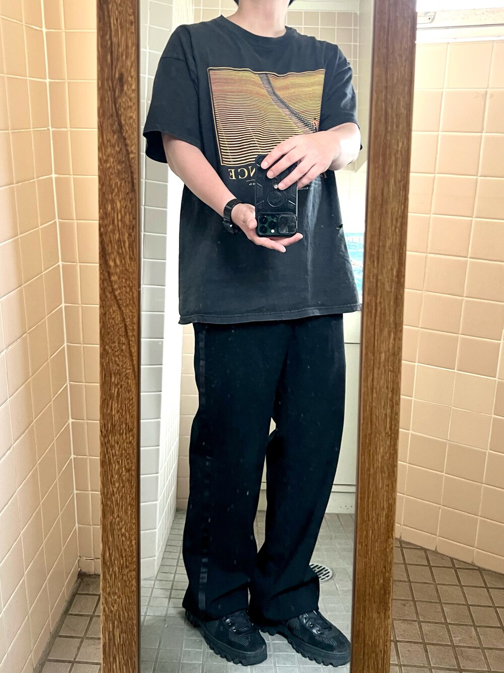 黒のパンツがさりげなく黒ラインが入ってるのがお気に入りです Tシャツの文字が 「忍耐」なのも好きです