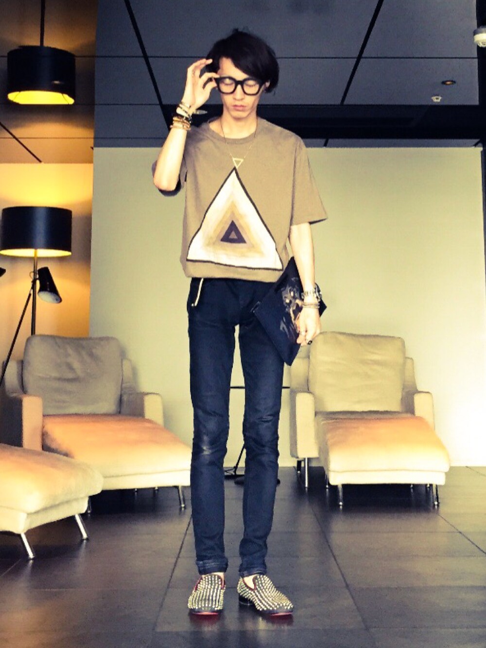 〜Tシャツインスキニー〜 昼はグラサン、夜メガネ。 ・T-shirt: Paul Smith ・shoes: Christian Louboutin ・necklace: JOHN LAWRENCE SULLIVAN