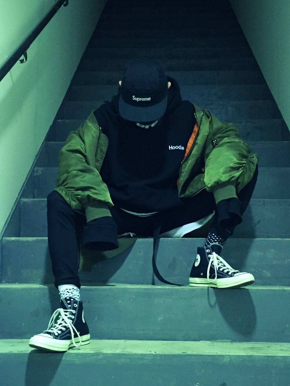 ・blouson: NO BRAND ・hoodie: VETEMENTS ・inner: Fear of God ・sneaker: CONVERSE ・cap: Supreme ・headband: Supreme x NEW ERA