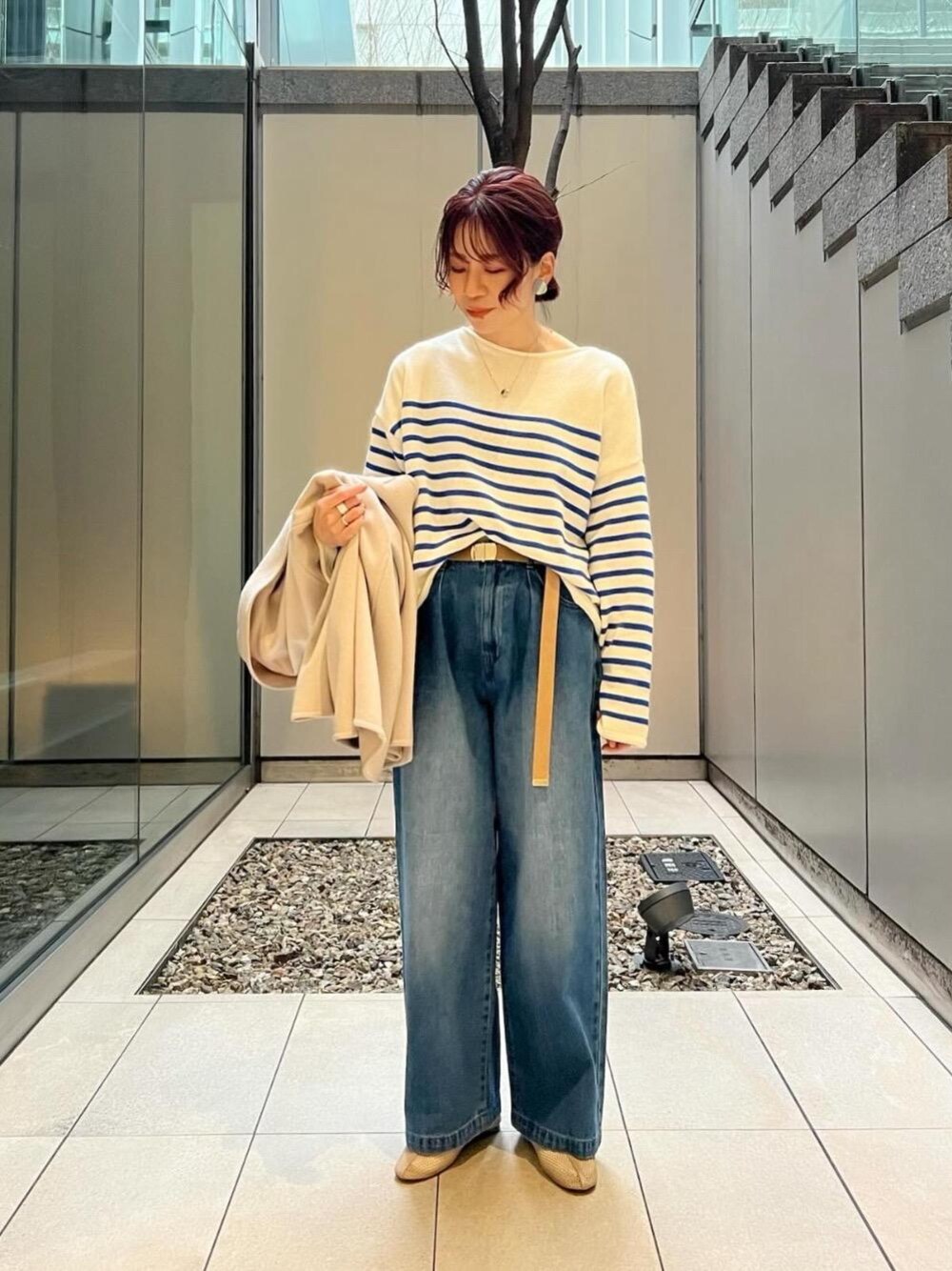 40代前半/156cm/骨格ナチュラル/普段サイズS/ サイズS 【TRICOTS JEAN MARCボーダーニット】 サイズ感:ややショート丈。ゆったりめ。 素材感:綿とポリエステルの柔らかなニット素材。手洗い可能。 着用感:シンプルながらに存在感のあるニットは、絶妙なサイズ感でボトムを選ばず様々なスタイリングを楽しめます◎