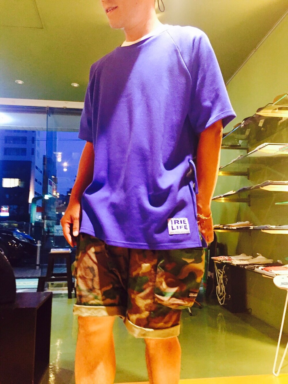 TEEシャツにカットオフのカットソーでレイヤードをきかせ、カモのショートパンツにブルーを合わせる