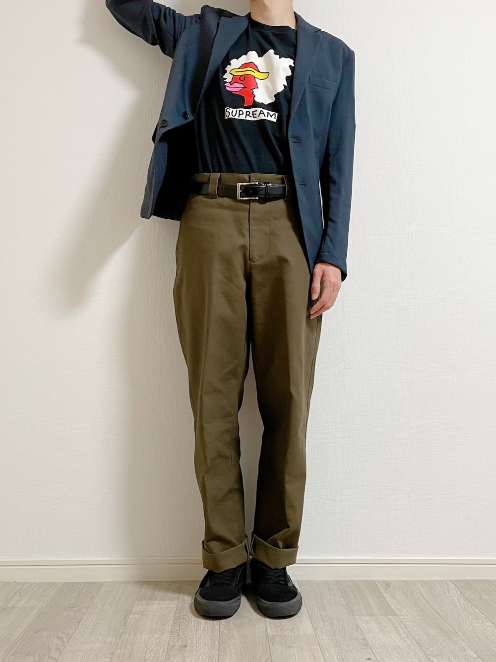 . キレイめのコーデの中に遊び心を😁 中のTシャツをタックインして ラフになりすぎないように意識しました。 . . . . . ▷OUTER #417edifice ¥〜10,000 ▷TOPS #supreme ¥7,500 ▷BOTTOMS #mhl ¥27,500 ▷SHOES #vans ¥11,000 .