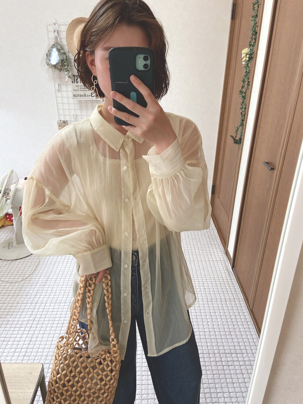 GUのシアーシャツ袖のふんわり感が可愛い💕 1番上のボタンだけ留めてみました👀 大人っぽく、色味で可愛さを出しました🕺
