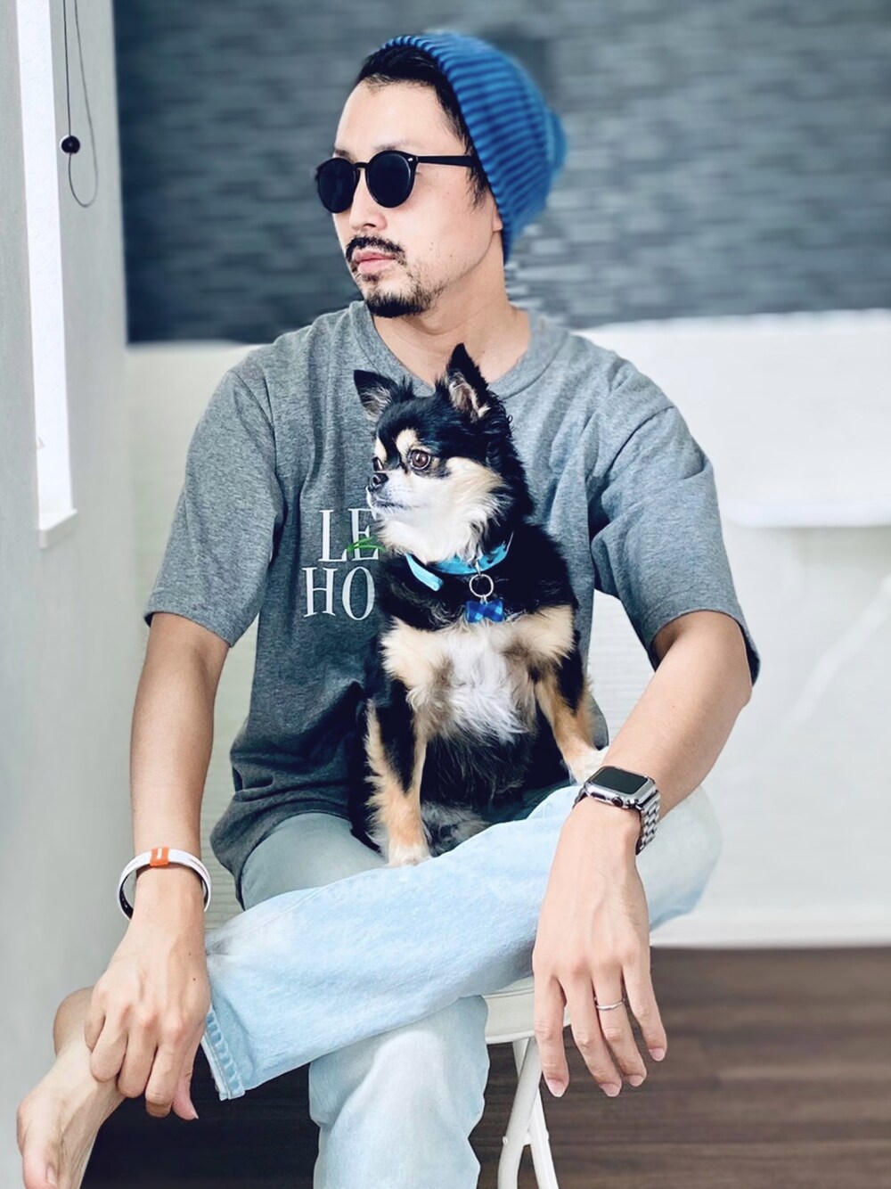 豆柴ではありません。チワワです! グレーTにデニムパンツ合わせの シンプルコーデ ニットがお気に入り 素材が固めで形がGOOD