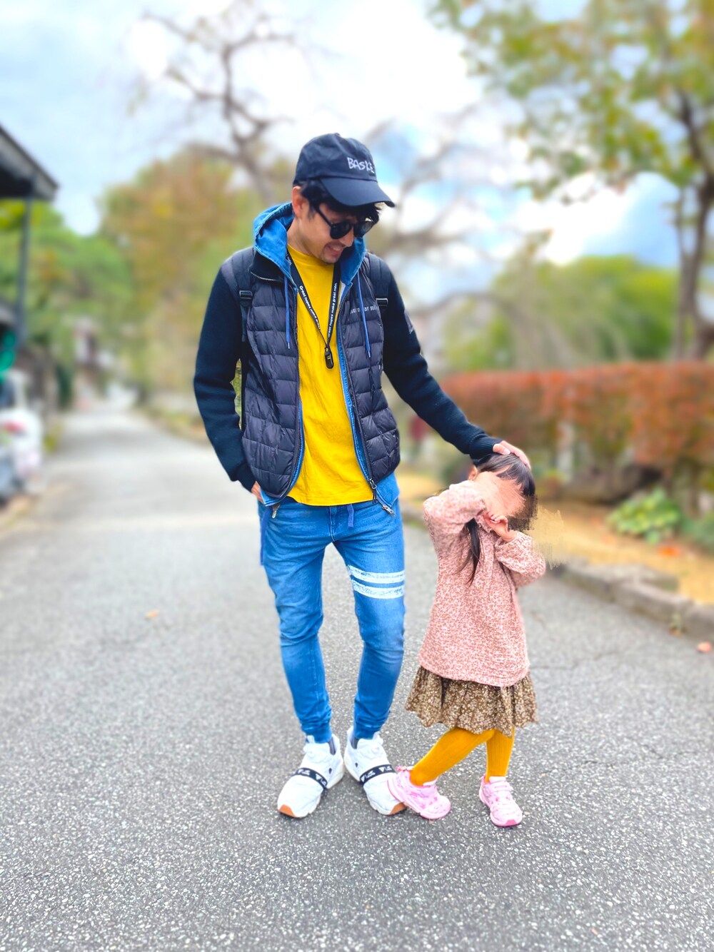 動きやすい セットアップ スウェットコーデ 寒い時は上から羽織るのも良し 娘は柄物重ね着 アウター忘れたから あるものを被せただけw