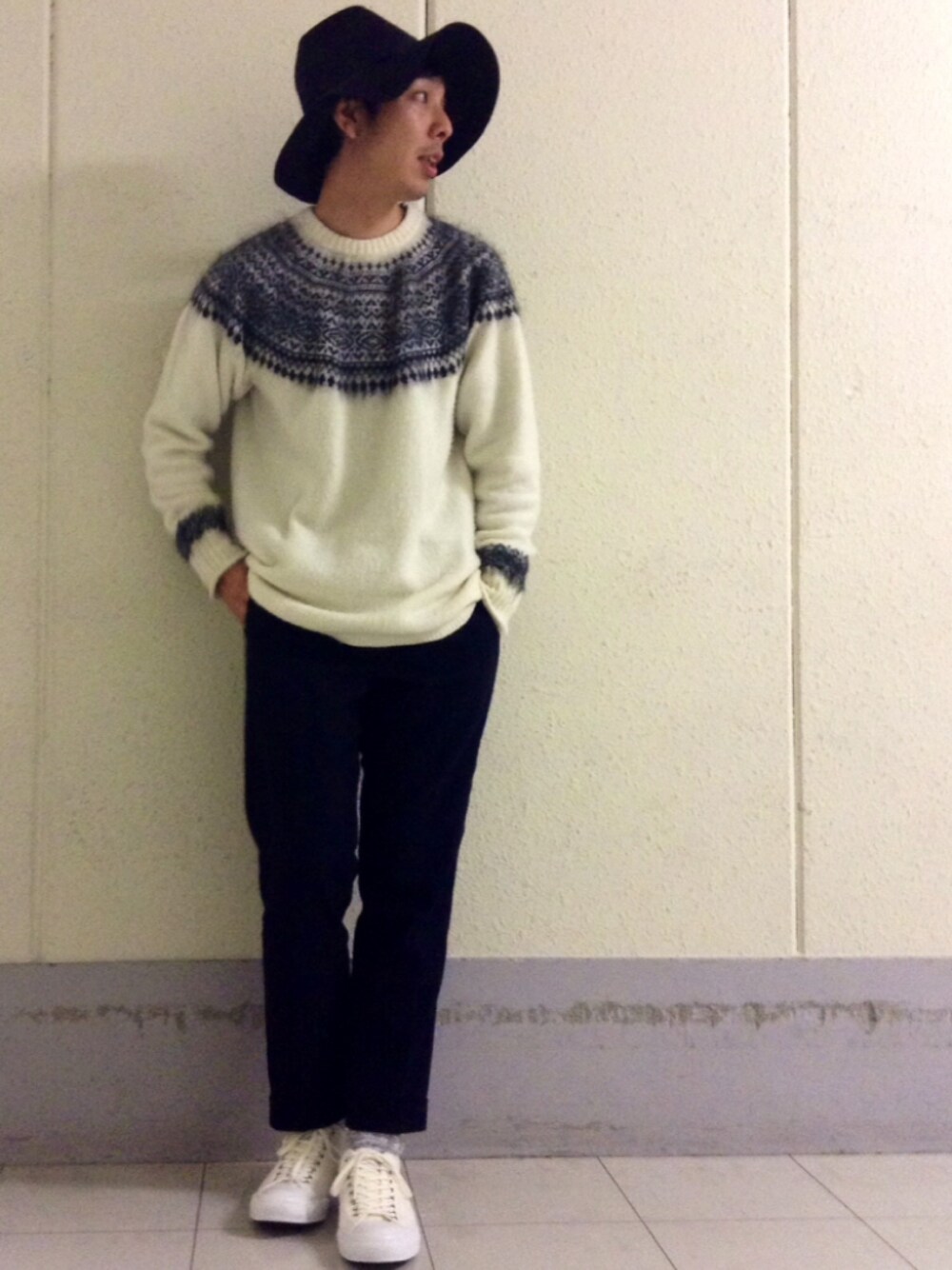 こんにちは。 久々に柄物を着ましたが、 やっぱり好きですね。テンション上がります。 シャギー・フェアアイル・ホワイト・オーバーサイズと、自分にとっては最強のカルテットです。 皆様のクローゼットにも是非。 秋から冬への一歩目に・・・