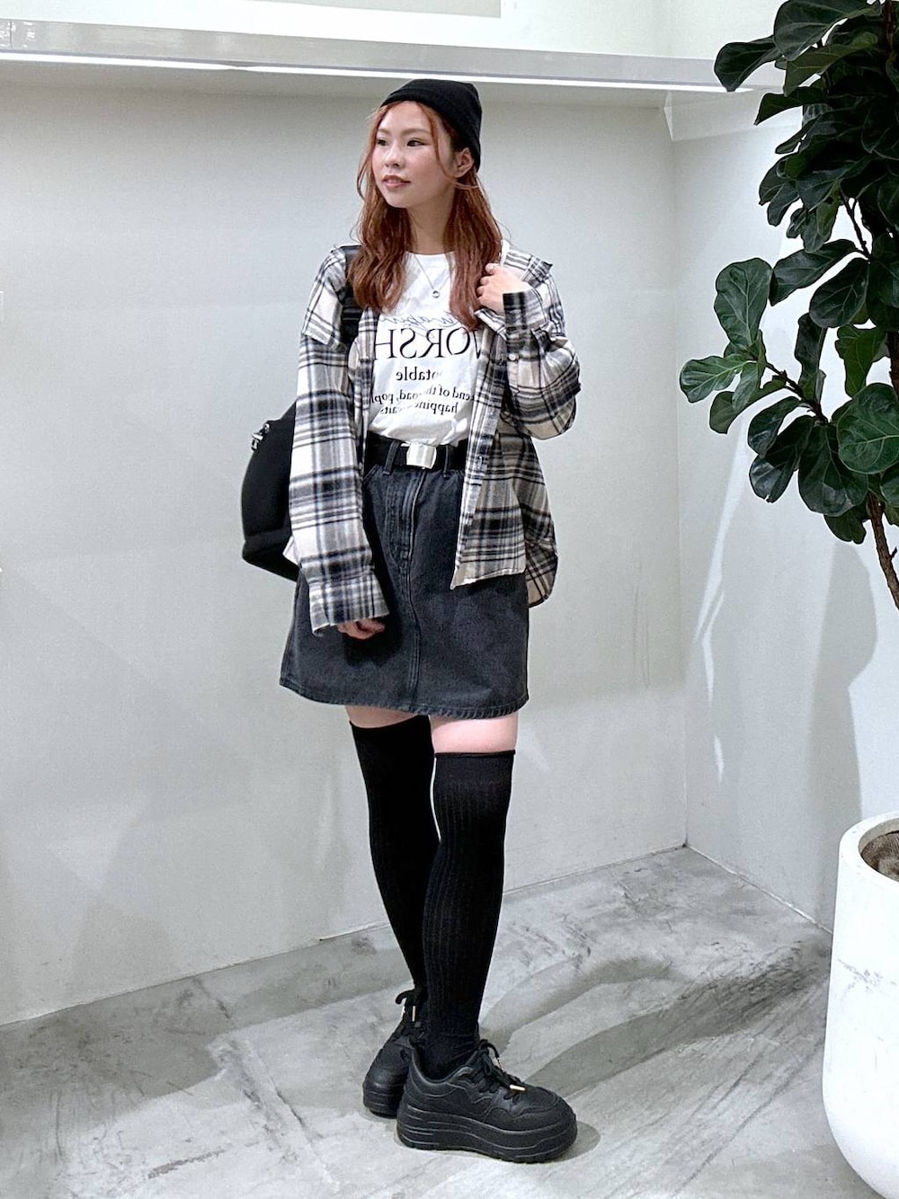カジュアルモノトーンコーデ 【シャツ】 モノトーンでも軽さのあるカラー配色のチェックシャツ。サイズフリーサイズでルーズなシルエット。丈もお尻がすっぽり隠れるのも嬉しいポイント! 【Tシャツ】 加工があるので1枚で着てもオシャレ見えするロゴTシャツ。ゆったりシルエットで身体のラインを拾いにくいです。袖口がリブになっているので、袖にボリューム感が出るのも可愛いです。 【スカート】 Leeの別注デニムスカート。裾にかけて広がったシルエットなのでミニスカートでも足をスッキリ見せてくれます。丈は短過ぎない長さですが、個人的にハイウエストが好きなので少し上目で履いてます。ジャストな位置で履くともう少し丈は長くなります。 BAYFLOW shop staff. ☞ 162cm / 骨格ウェーブ / ブルベ冬 ✔︎トレンド感のある大人カジュアル ✔︎シンプルで高見えするスタイリング ✔︎着痩せ/細見え/スタイルUPコーデ Instagram @june.bf