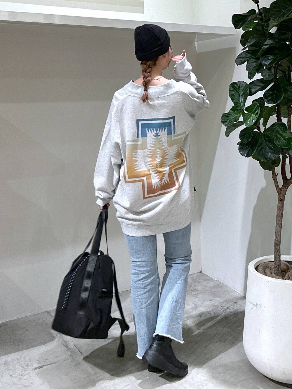 【スウェット】 メンズのMサイズ着用。バックプリントがアクセントになったペンドルトンのスウェット。162cmの私が着てお尻がすっぽり隠れる丈感。ゆったりしたサイズ感ですがフロントはハーフジップ仕様でVネックに大きく開くのですっきりと見えるのがポイント! 【ボトムス】 広がり過ぎないフレアシルエットなのでストレート寄りのすっきりしたシルエットで着用できるパンツ。裾はフリンジになっているのでシンプルコーデのアクセントにも!ストレッチ性もあり楽な履き心地です。 ぜひチェックして下さい☺︎ BAYFLOW shop staff. ☞ 162cm / 骨格ウェーブ / ブルベ冬 ✔︎トレンド感のある大人カジュアル ✔︎シンプルで高見えするスタイリング ✔︎着痩せ/細見え/スタイルUPコーデ Instagram @june.bf
