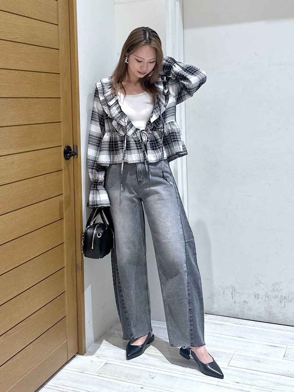 袖と襟元のデザインが可愛いブラウス。 私にはデニム合わせでもやっぱり少し可愛すぎました。 そんな時はオフショル風に着て肌見せしたらちょうど良いバランスに✨(4枚目の写真) 着方次第で雰囲気変えられる優秀ブラウスですね。