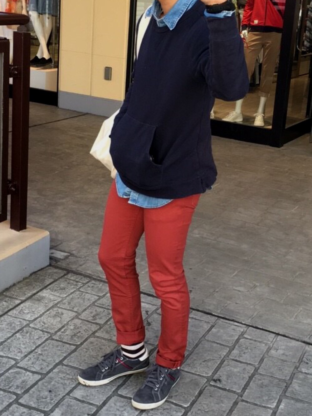 ワインレッドのパンツが派手? 今まで持ってなかったワインレッドを着てみました。 デニムの上に紺のトレーナー。