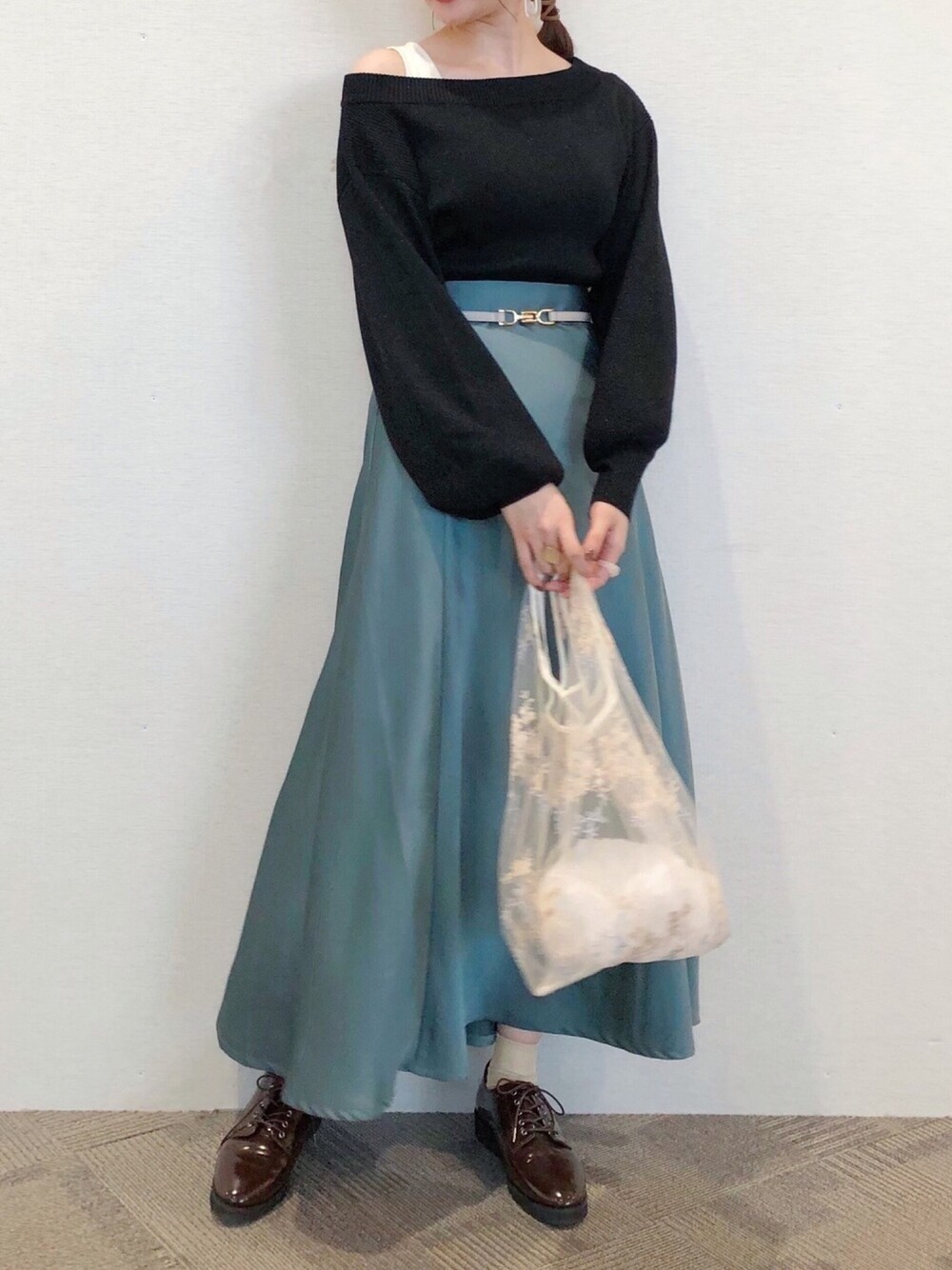 ラメニット×サテンスカートで大人きれいめコーデ☆ ラメニットはあえてワンショルで着て 抜け感を出しました♪ ボリューム袖やさりげないラメ感が 女性らしくしてくれるアイテム❤︎ すっきりシルエットで 光沢感が上品なサテンスカートと 相性抜群です◎ Instagram☞【@hinata_mystywoman】