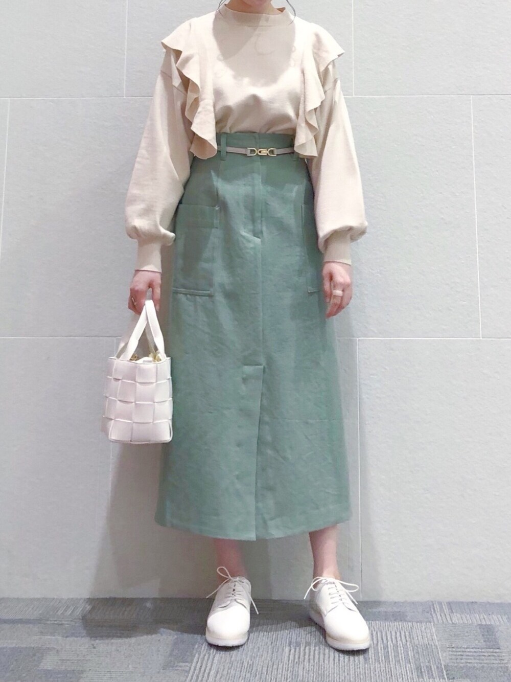 ひ な た(mysty woman 本部)のニット/セーター「ショルダーフリルプルオーバー 938719」を使ったコーディネート