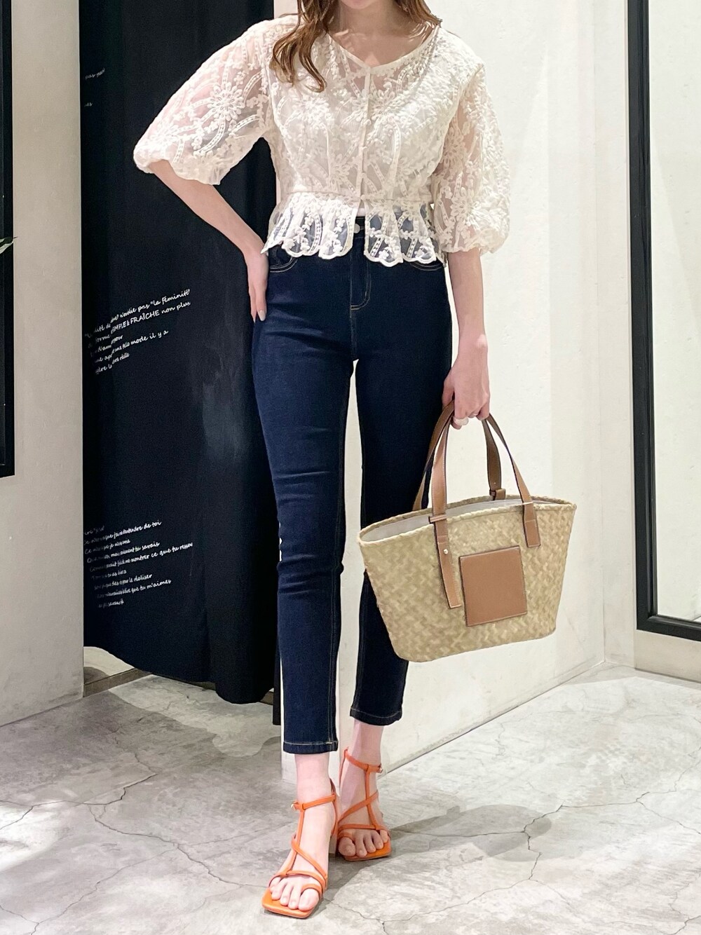 ひ な た(mysty woman 本部)のシャツ/ブラウス「刺繍レースペプラムブラウス 275572」を使ったコーディネート