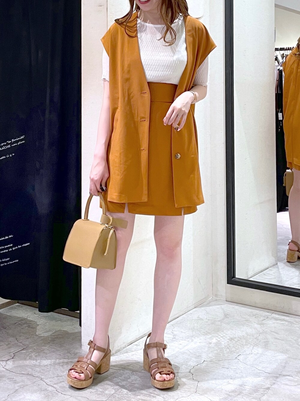 ひ な た(mysty woman 本部)のベスト「ノーカラーミドルジレ 285439」を使ったコーディネート