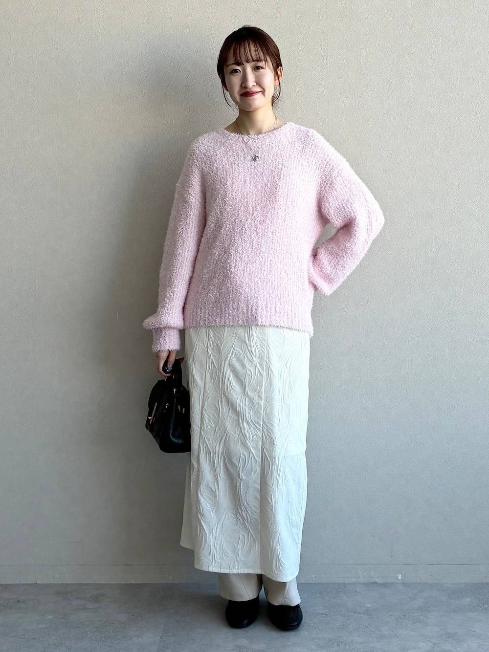 ★ファンシーニット シャギーニットにテープヤーンをMIXさせた 他にはない表面感が目を惹くニット。 160cmの私で腰くらいの着丈なので アウトでも前だけインでも着やすいサイズ感。 厚手すぎないニットなので 今から春まで長く着ていただけます◎ ★フラワージャガードキャミワンピース 立体感のあるジャガード生地で コーデのアクセントになるキャミワンピ。 裏地付きなのでキャミワンピースとしても 安心してきていただけます。 160cmの私で脛くらいの着丈だったので パンツと合わせてレイヤードするのもおすすめ◎ ★カーブワイドパンツ トレンドのたぽっとシルエットのパンツ。 サイドにボリュームがでるカーブパンツですが、 ウエストにタックを仕込んでシルエットのメリハリがでて 着膨れせずに着ていただけます。 ボリュームのあるパンツなので トップスはコンパクトなものを合わせると骨ストさんは◎