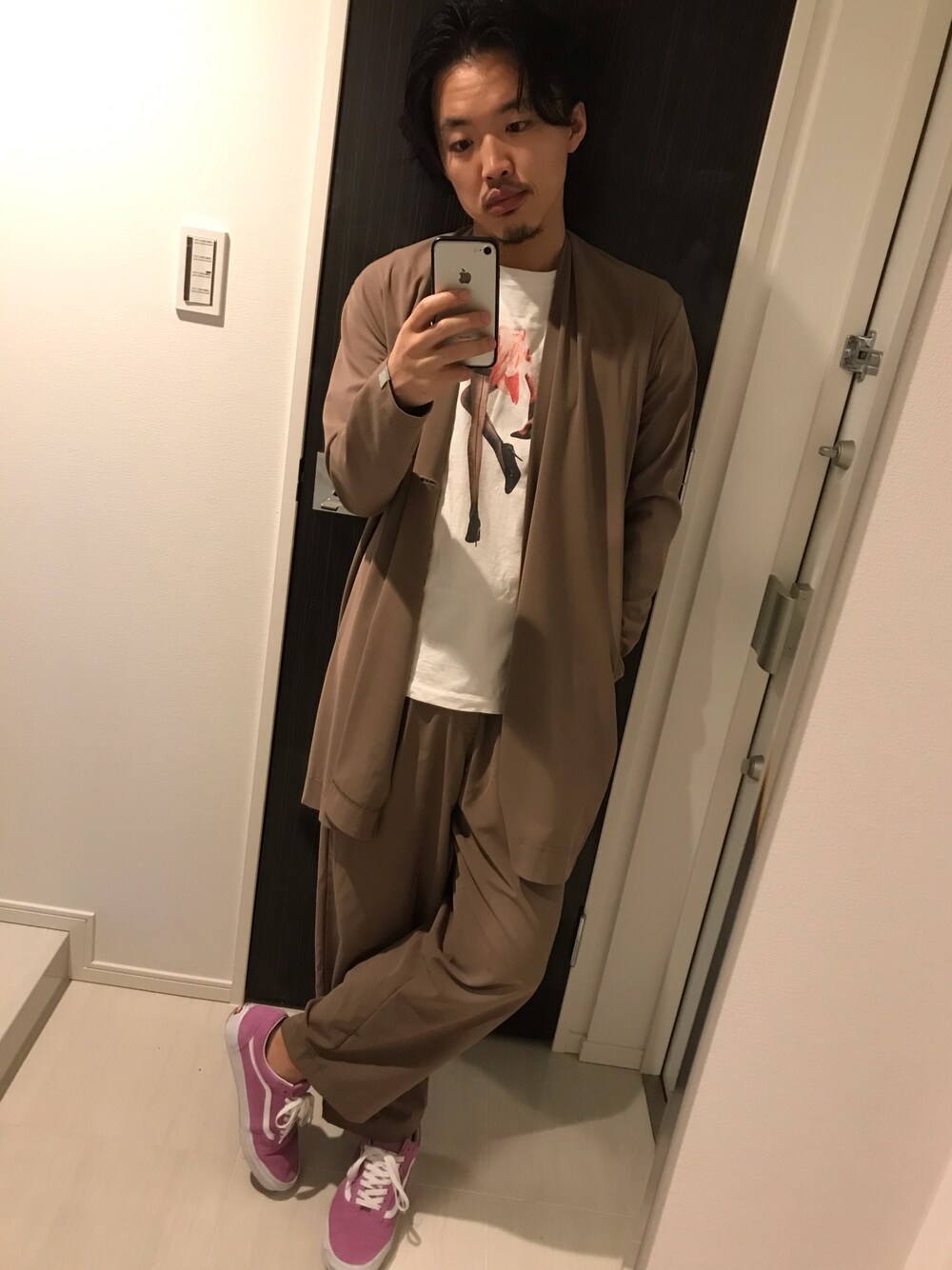 おはようございます☀ 今日のコーデ。ゆったりサイズのセットアップからフラミンゴちょい見せ🦢スニーカーもピンクで合わせました。個人的には細身も好きだけど、ゆったりサイズはノンストレスで着用できて、ほんと楽ですね✨ 週の真ん中、さすがに朝早い出勤が続くと疲れが溜まってきますね💦 体調管理に気をつけて、今日も一日頑張りましょう🙌