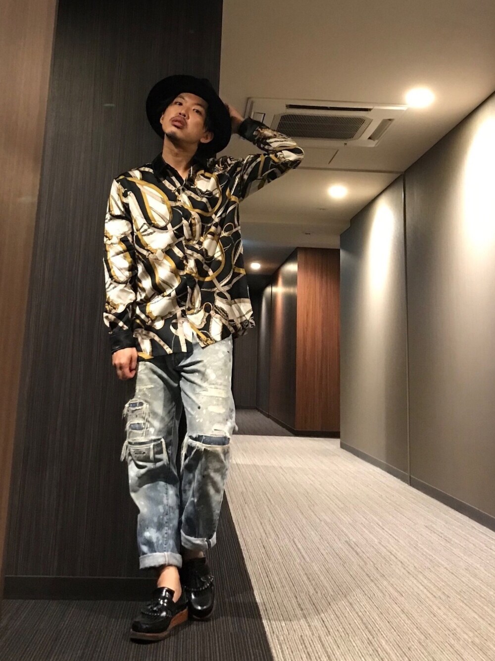 おはようございます☀ 今日のコーデ。 チェーン総柄のシャツにリメイクデニム👖 サテンのクレリック仕様がドレッシーな雰囲気に✨ なので、足元はローファーで。 今日も素敵な一日をお過ごしください🙌