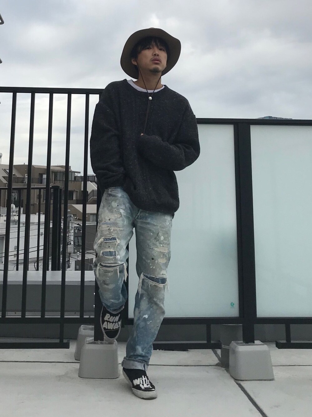 おはようございます☀ 引っ越しまして、バルコニーから今日のコーデ。 ゆるーいニットをダメージ加工のデニムで武骨に甘辛ミックス。 今日も素敵な一日をお過ごしください🙌