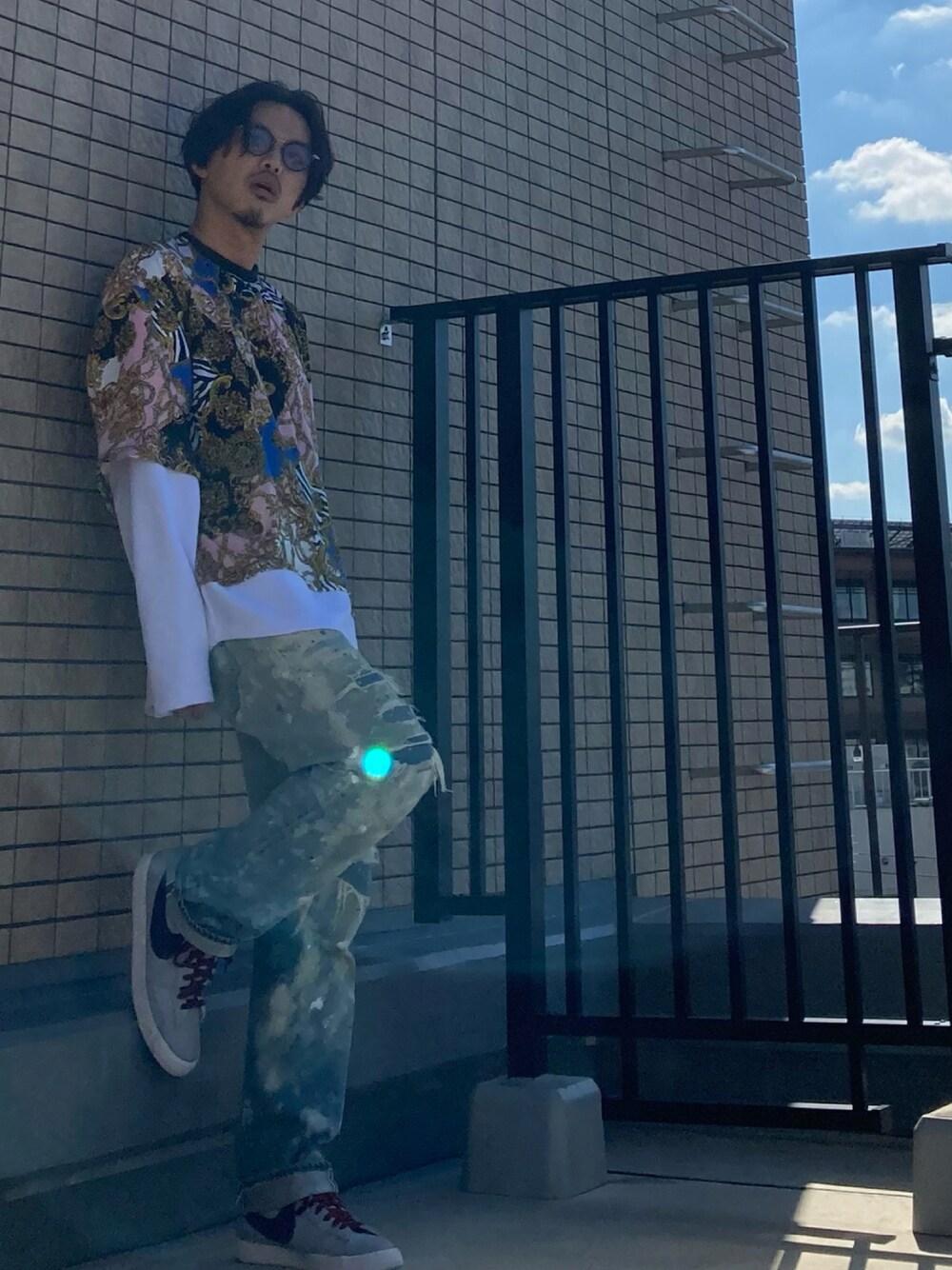 おはようございます☀ 今日のコーデ。 インパクトのある総柄カットソーにリメイクデニム。 いい柄です。 今日も素敵な一日をお過ごしください🙌