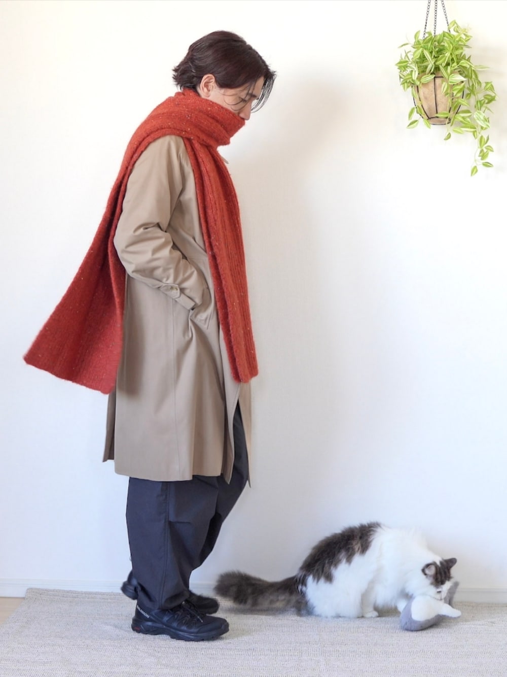 ZARAのセールで購入したブラッシュフィニッシュマフラーを主役にコーデ組んでみました。 このマフラー超厚手で暖かくて存在感もあってすっごく気に入っています!…が、めちゃくちゃ毛が抜けるので黒と合わせづらい!😂ということで古着のバーバリーのコートに合わせました。 上半身がきれいめなので、下半身はガバっと大きいパラシュートパンツと、SALOMONのスニーカーでバランスを取っています。スポーツミックスってこれで合ってるんだろうか笑 詳しい人教えてほしいです!